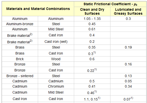 به عنوان مثال در جدول روبرو می تونین ضریب اصطکاک ایستایی برای سطوح مختلف رو که با آزمایش به دست آمده ببینین :